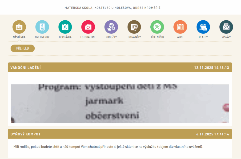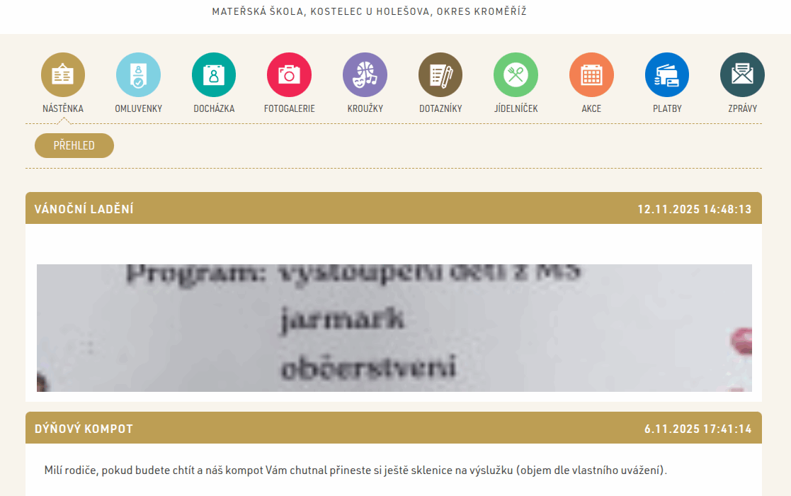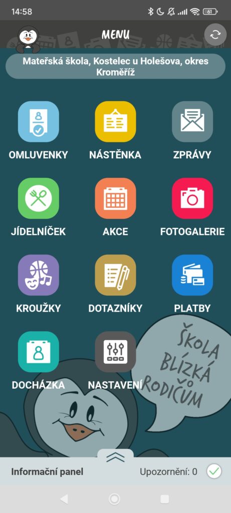 Od letošního školního roku i naše mateřská škola využívá aplikaci “Naše MŠ – škola blízká rodičům”, kde se rodiče dozvědí nejnovější informace z dění v naší mateřské škole jako jsou informace na nástěnce, fotografie, chystané akce, jídelníček. Také zde můžou rodiče komunikovat přímo i se školkou přes sekci zprávy.
